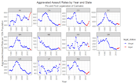 Start with aggravated assault, which is more frequent than murder and thus has a stronger signal, statistically speaking. Notice that I'm color-coding based on the year that cannabis was legalized. Colorado and Washington legalized in 2012. Oregon, Alaska, and DC legalized in 2014. California, Nevada, Massachusettes, and Maine legalized in 2016, and Vermont legalized in 2018. The data is only through 2018, so we only get one post-legalization data point for Vermont. (If the figure is overlapping the stuff on my side-bar, note that you can click directly on the figure to enlarge it for a clearer view.)